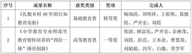 近日,江苏省教育厅公布了2021年江苏省教学成果奖获奖项目名单,我院两项成果获奖。其中,严开宏老师和刘霞老师共同参与完成的《扎根乡村40年的行知教育实验》荣获基础教育类特等奖;由张波教授主持、我院教师共同完成的《小学教育专业师范生教育情怀培养的“四位一体”路径创新》荣获高等教育类一等奖。